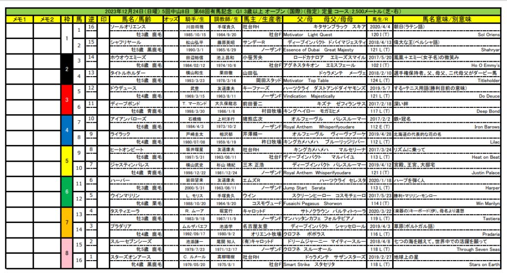 有馬記念出走登録確定 サイン競馬第68回有馬記念枠順確定 X Facebook はてブ Pocket LINE コピー 2023.12.22 有馬記念枠順が確定しました。スターズオンアースは8枠16番、タスティエーラは、7枠13番ドウデュースは、3枠5番にゲートインしました。 16頭出馬表23年第68回有馬記念 G1確定1ダウンロード