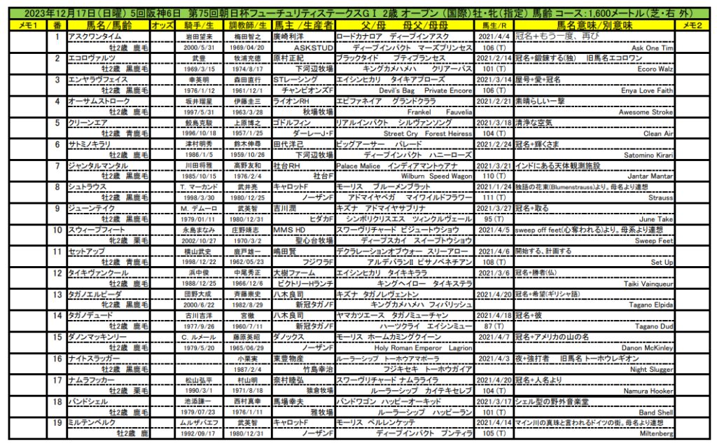 朝日杯フューチュリティステークスは、JRAが阪神競馬場で施行する中央競馬の重賞競走(GI)である。 競走名の「フューチュリティ(Futurity)」は、英語で「未来」「将来」を意味する。 正賞は朝日新聞社賞、日本馬主協会連合会会長賞。出走資格:サラ系2歳牡馬・牝馬(出走可能頭数:最大18頭)